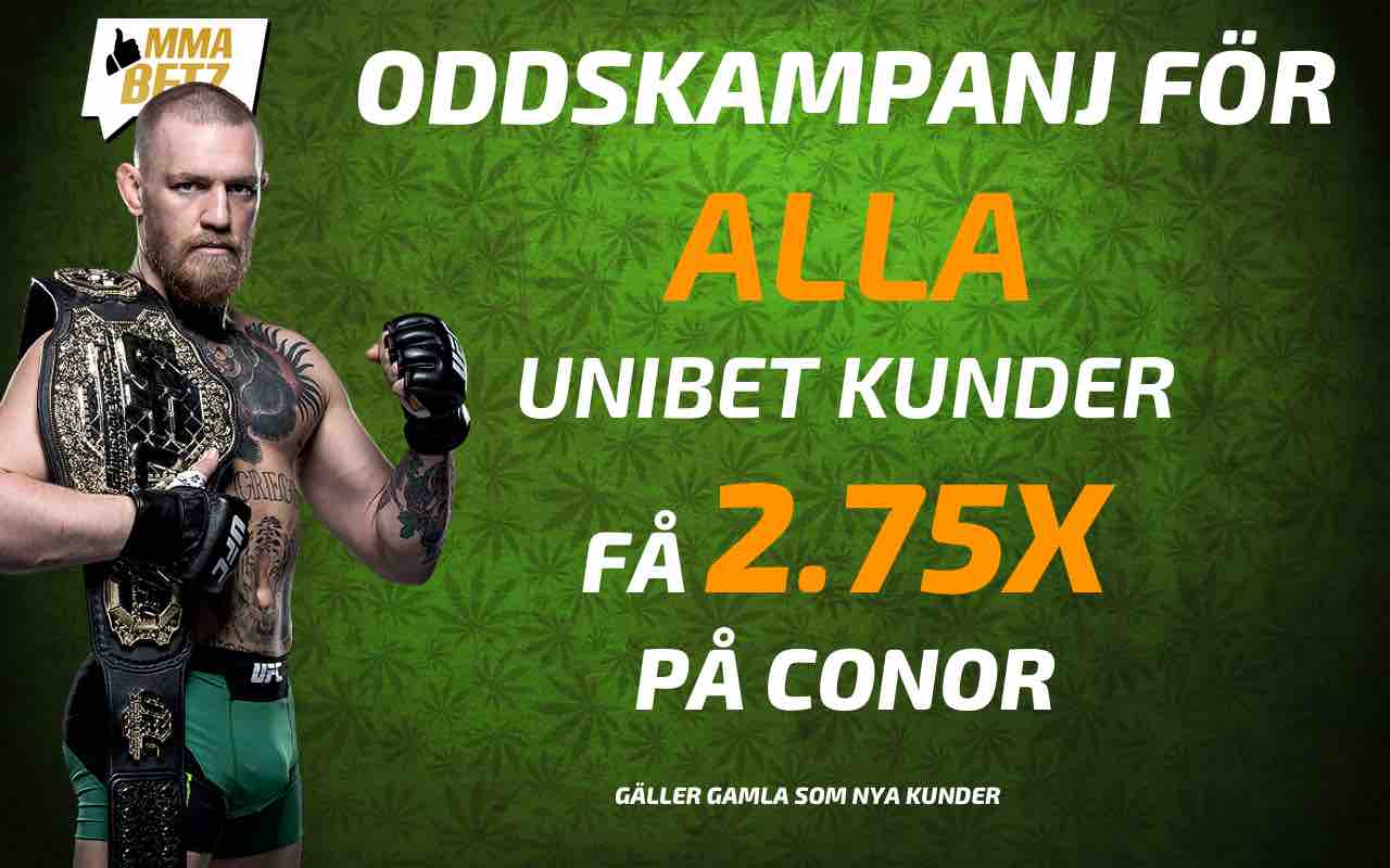 Inatt kliver den forne mästaren Conor McGregor in i UFC-buren efter två års frånvaro. Han ställs mot den regerande mästaren Khabib Nurmagomedov på UFC 229 i Las Vegas. Inför den karismatiske irländarens comeback har Unibet höjt oddset på Conor till hela 2.75x pengarna! Detta erbjudande gäller alla Unibetskunder, gamla som nya.