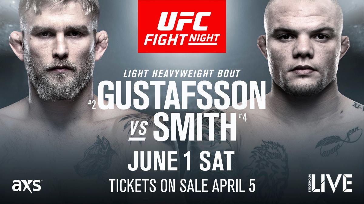 Under onsdagen blev det officiellt att svenska UFC-stjärnan Alexander Gustafsson kommer att ta sig an amerikanen Anthony Smith under UFC:s kommande gala i Globen, Stockholm den 1:a Juni. UFC bekräftade matchningen via deras sociala medier.