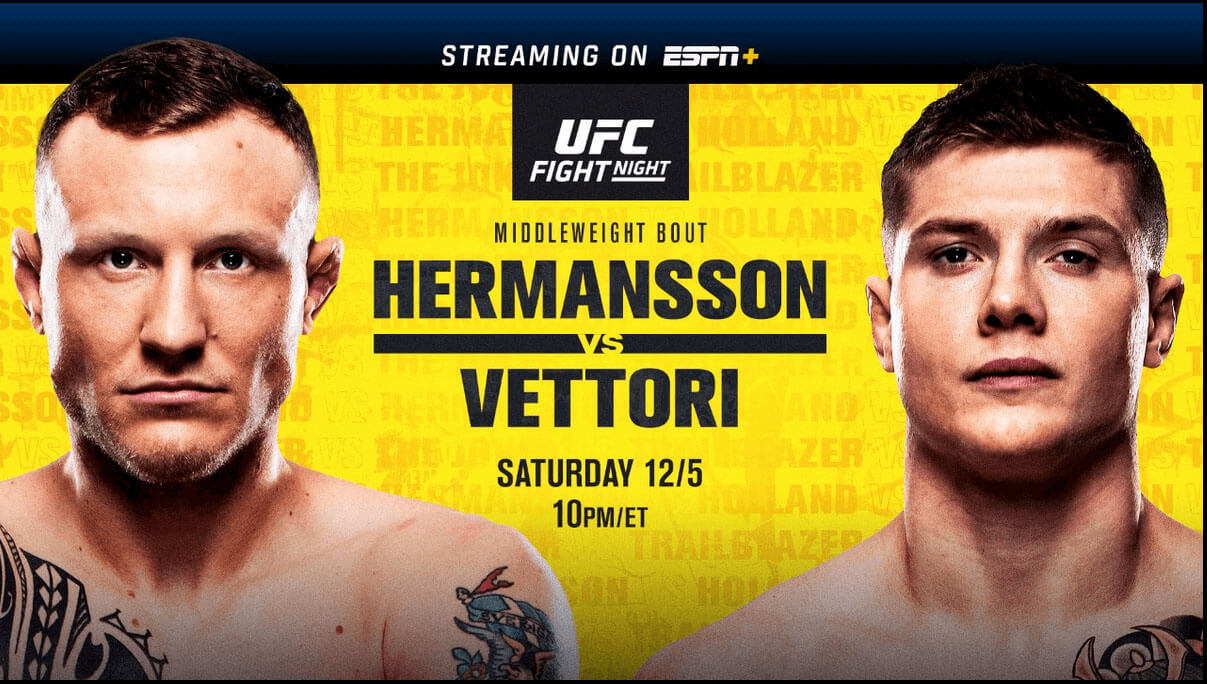 Hermansson (21-5) går inatt nästa match på resan mot titelmatchen då han tar sig an Marvin Vettori som hoppat in för Kevin Holland som i sin tur hoppade in för Darren Till. Hermansson såg vi senast submitta Kelvin Gastelum genom submission (heel hook) efter 1 minut och 18 sekunder. Innan detta avslutades svensken via TKO av Jared Cannonier via TKO hösten 2019. Dessförinnan tog han en av sina största skalper i karriären då han vann över Ronaldo ’Jacare’ Souza via enhälligt domslut.