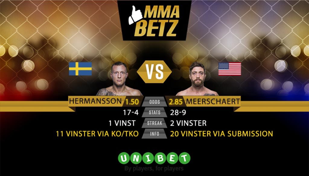 Hermansson är en klar favorit i den här matchen. Troligtvis beror detta på att hans insatser i UFC varit en aning vassare och mot en aning bättre fighters. Samtidigt är detta en match som passar svensken som är mer än bara kapabel på marken och därför lär kunna klara sig från att fastna i något av Meerschaerts submissionförsök.