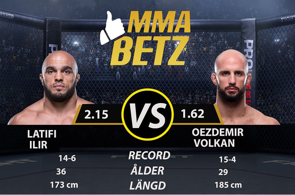 Latifi har gjort sin läxa från senaste matchen gällande konditionen och även om Oezdemir har extrem KO-power så tror vi på en vinst för Latifi i denna fight. Latifis brottning kommer fälla avgörandet och vinsten kommer via submission eller via ground and pound när Ilir har topp-position.